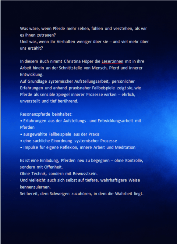 Resonanzpferde ist ein Buch, das dazu einlädt, sich selbst im Pferd reflektiert zu erkennen. Es zeigt, wie eng die eigene innere Haltung mit dem Verhalten des Pferdes verbunden ist – und wie sich darüber neue Wege im Umgang eröffnen können.